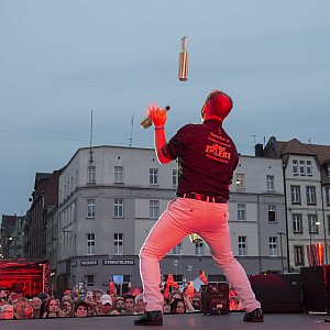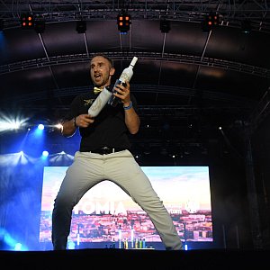 Zabawa trwała w najlepsze, na scenie pojawiali się kolejni wykonawcy. Śpiewał Paweł Gołecki, a znany, pochodzący z naszego miasta showman i mistrz w żonglowaniu butelkami Krzysztof Drabik dał widowiskowy pokaz. Podrzucane przez niego butelki fruwały w powietrzu, światła i dym robiły za tło, a do tego Drabik raz po raz wypluwał z siebie ogień. Widzowie klaskali, robiło to wielkie i niesamowite wrażenie.