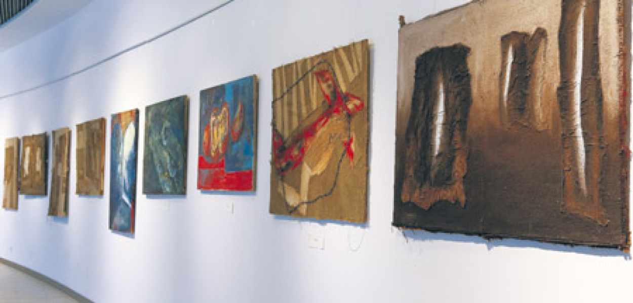 Z kolei w „Agorze” Nowakowski zaprezentował się z innej strony. Wystawa pokazywała jego obrazy wykonane oryginalną autorską techniką – łączącą zgrzebne płótno z drewnianym fornirem oraz farbami olejnymi, a czasem także (jak w pracy zatytułowanej „Katyń”) z drutem kolczastym.