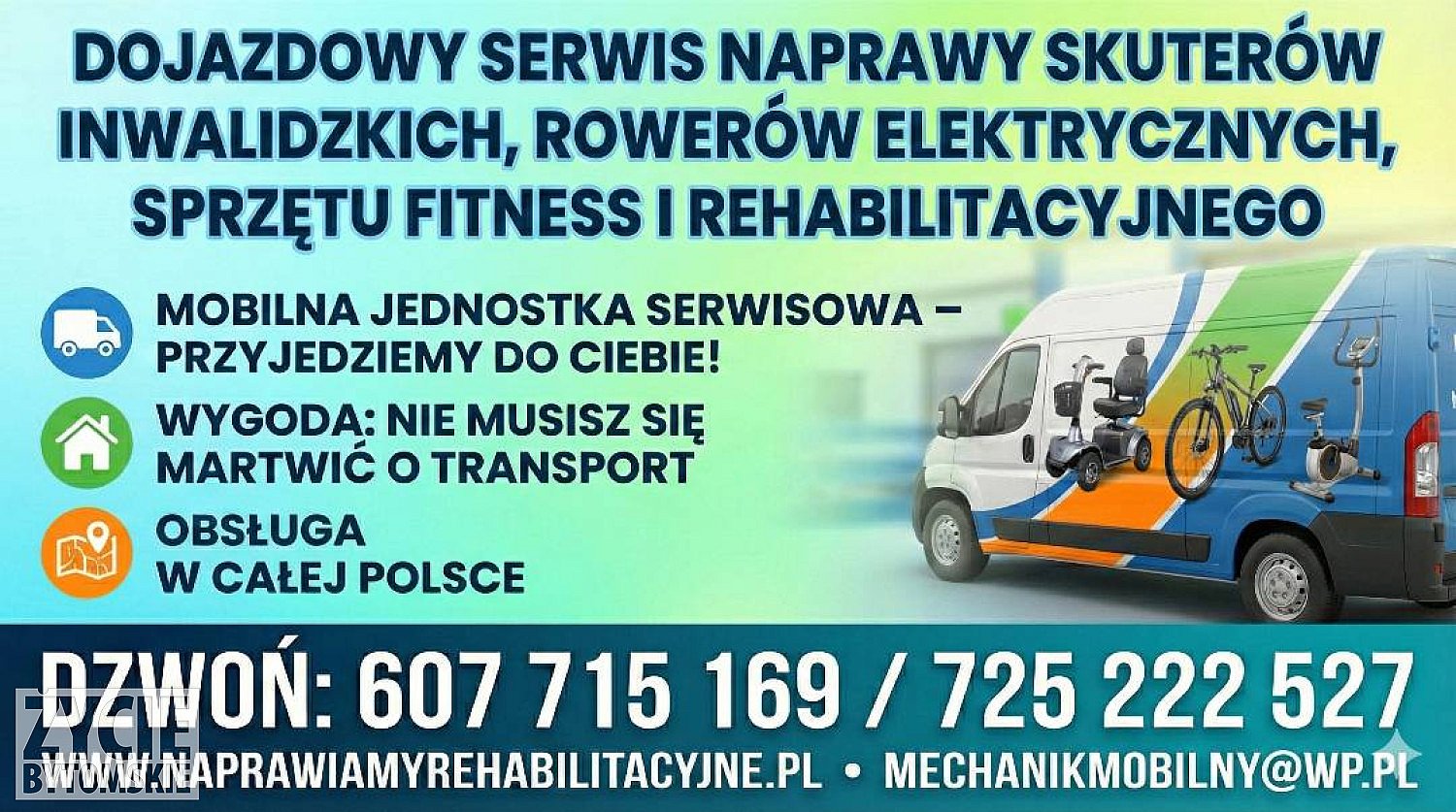 Dojazdowy Serwis Naprawy to profesjonalny zespół techników specjalizujących się w serwisie skuterów inwalidzkich Shoprider, Imperial, Delux, Perrero, Electroride, Faster, Frost i innych modeli, a także rowerów trójkołowych, rowerów elektrycznych, sprzętu rehabilitacyjnego, sprzętu fitness oraz rotorów medycznych. Nasza mobilna jednostka dojeżdża bezpośrednio do klienta.